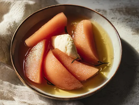 Det här är en dessert som ser elegantare ut än den är. Du kokar en lag, lägger i kvittenbitar och låter dem stå och sjuda i två timmar medan du gör något annat. När det är färdigt har du något som kan serveras på ett fint porslin med en klick mascarpone eller en kula glass, och se ut som om du spenderat dagen i köket.