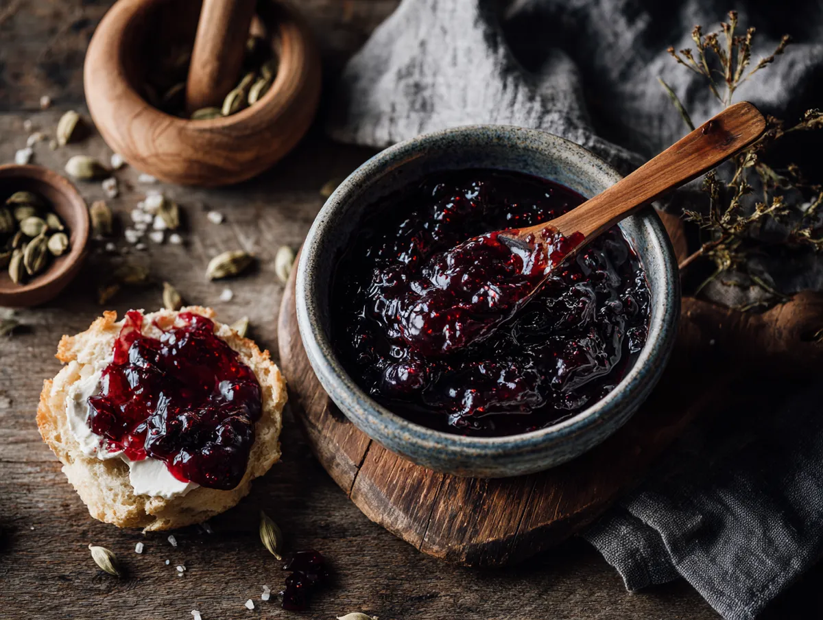 Kardemumma och slånbär är inte en kombination man möter ofta, men den ska finnas i fler kök. Det slagkraftiga i den här marmeladen är kontrasten: slånbärens mörka, nästan vinliknande syra och kardemummans varma, nästan parfymerade doft. Smakerna borde kollidera, men de gör tvärtom - de bär varandra.